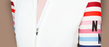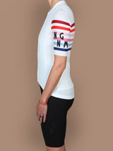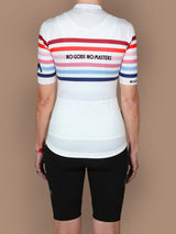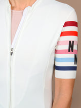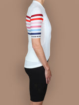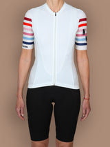 Our iconic powder pink symmetric sleeve bands are now featuring a beautiful multicolor stripe pattern, that runs all the way to the back of the jersey.